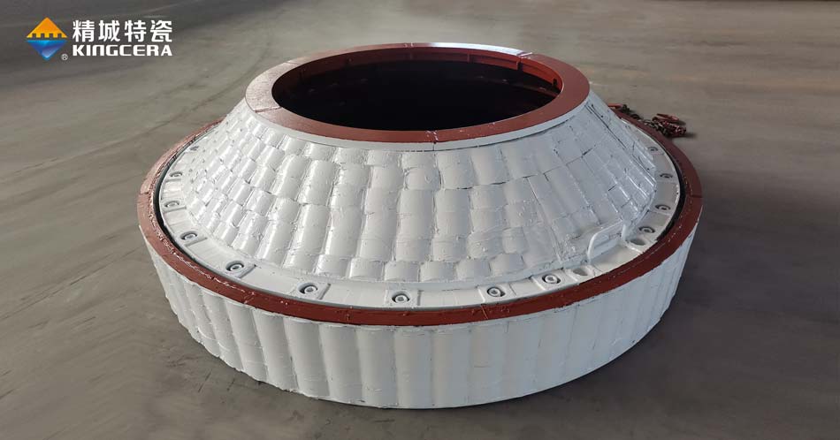 針對磨損如此嚴(yán)重的運行工況,我們推薦采用燕尾陶瓷異形結(jié)構(gòu)復(fù)合襯板防磨。具體是將燕尾形陶瓷固定到立磨鋼結(jié)構(gòu)上,耐磨陶瓷與鋼板間用耐高溫?zé)o機粘膠填充,陶瓷之間為零縫隙設(shè)計,360°錯位粘接固定工藝,縫隙相互錯開,表面光滑,可靠性大大增強,可抗沖擊,可以有效保證輥套的使用壽命延長10倍。