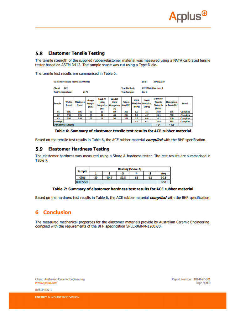 應澳大利亞必和必拓鐵礦公司要求,澳大利亞國際測試機構協會對湖南精城特種陶瓷有限公司生產的橡膠拉伸強度和硬度進形測試,該測試基于ASTM D412標準。經測試,精城特瓷的橡膠性能完全符合甚至超過必和必拓鐵礦公司對耐磨